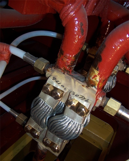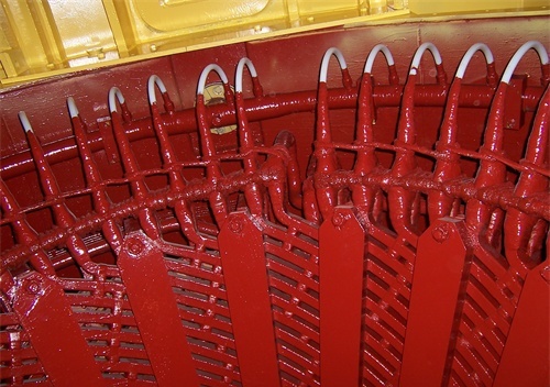 發(fā)電機(jī)下方的出線側(cè)連接螺絲都是純銅鍍銀的下方接封閉母線從發(fā)電機(jī)到變壓器的連接線都是封閉母線封閉母線會(huì)通正壓氣體,防止灰塵進(jìn)入這個(gè)銅塊很沉的這是發(fā)電機(jī)出線,絕緣包纏做絕緣之前是這個(gè)樣子的發(fā)電機(jī)的電流互感器安裝在藍(lán)色內(nèi)部白色的是純凈水管,用來(lái)冷卻發(fā)電機(jī)定子這是定子鐵芯和繞組。